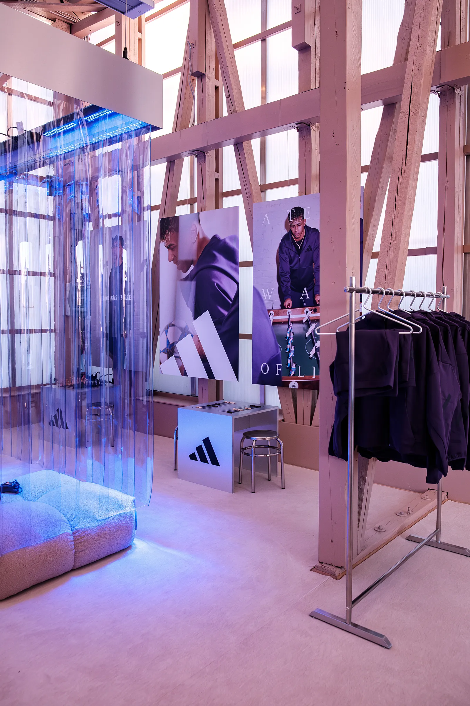 The facade features a vertically positioned container clad with screens, serving as a visible landmark from afar. The four distinct rooms of the ADISTUDIO surround a central patio, providing light and ventilation. Each room offers its own unique atmosphere, with openable walls that invite interaction and provide exciting views. Among other activities fans can personalize their adidas products or get styled in the barber shop.