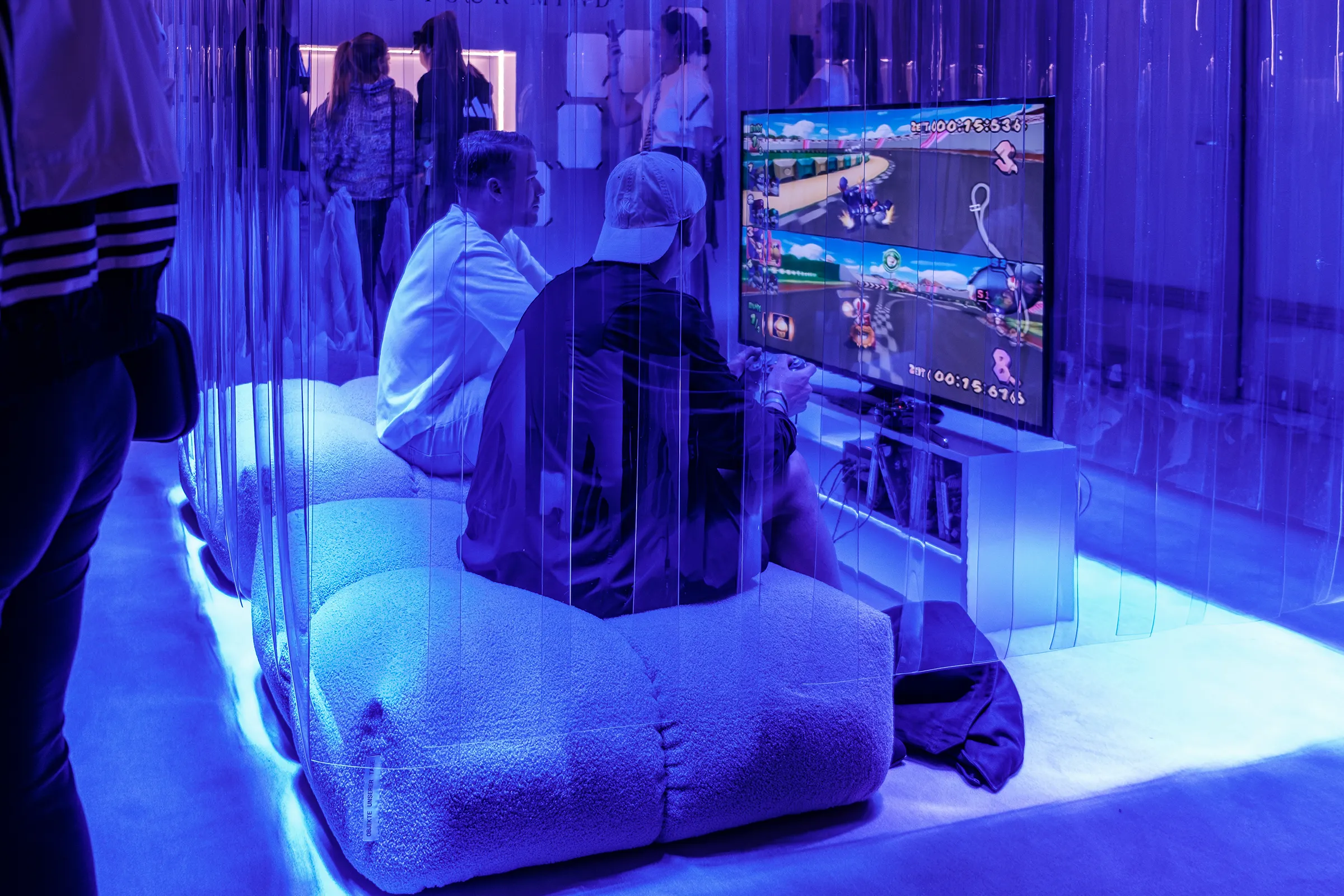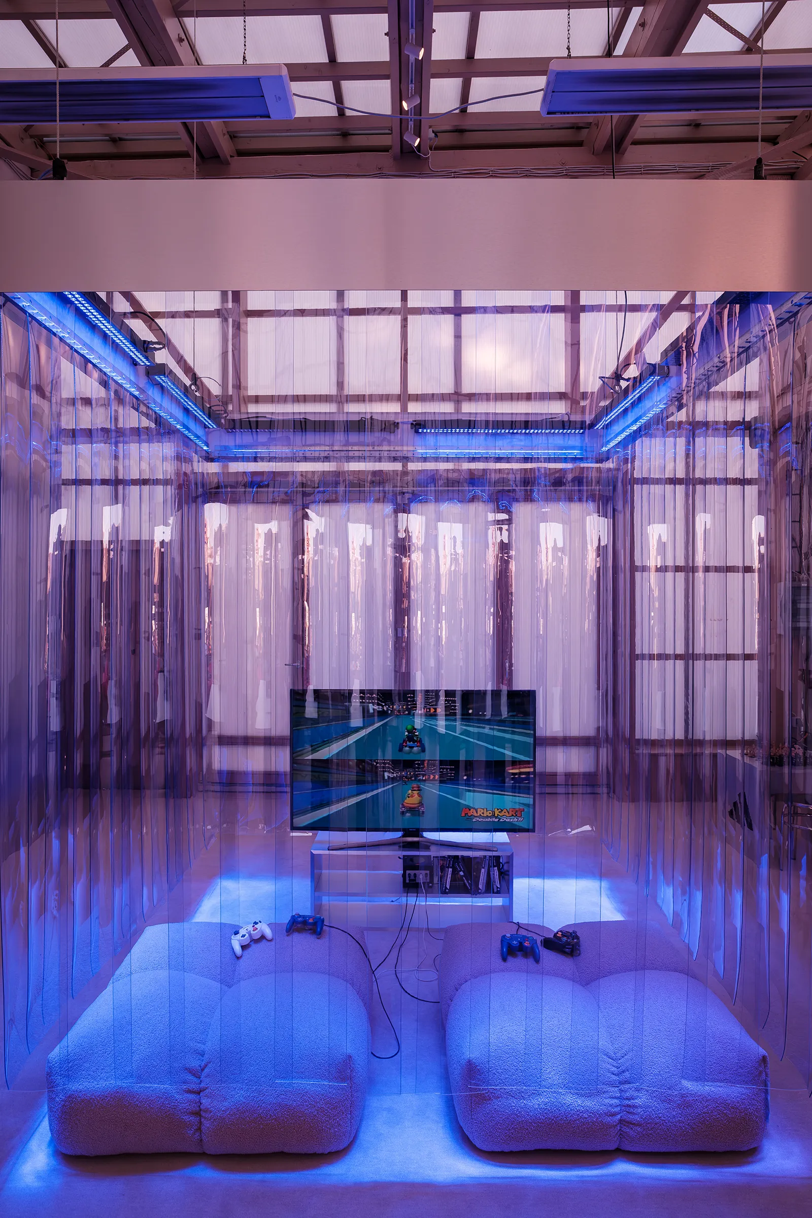 A transparent curtain created a floating “room within a room” inside the set as a small mini-living room for the Mario Kart zone. On specially designed game tables, chess and backgammon could be played.