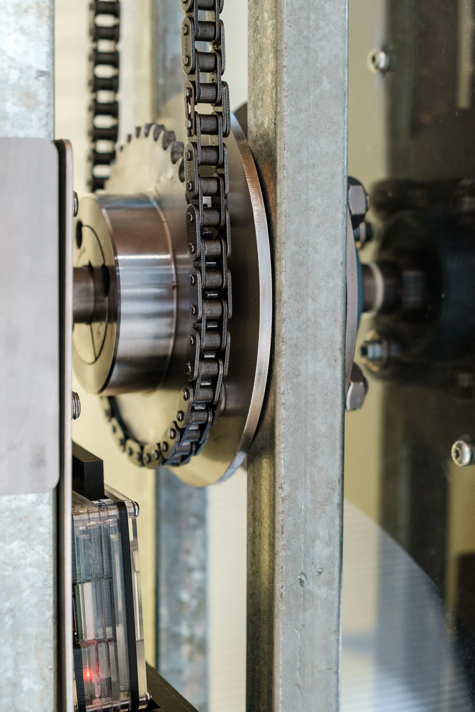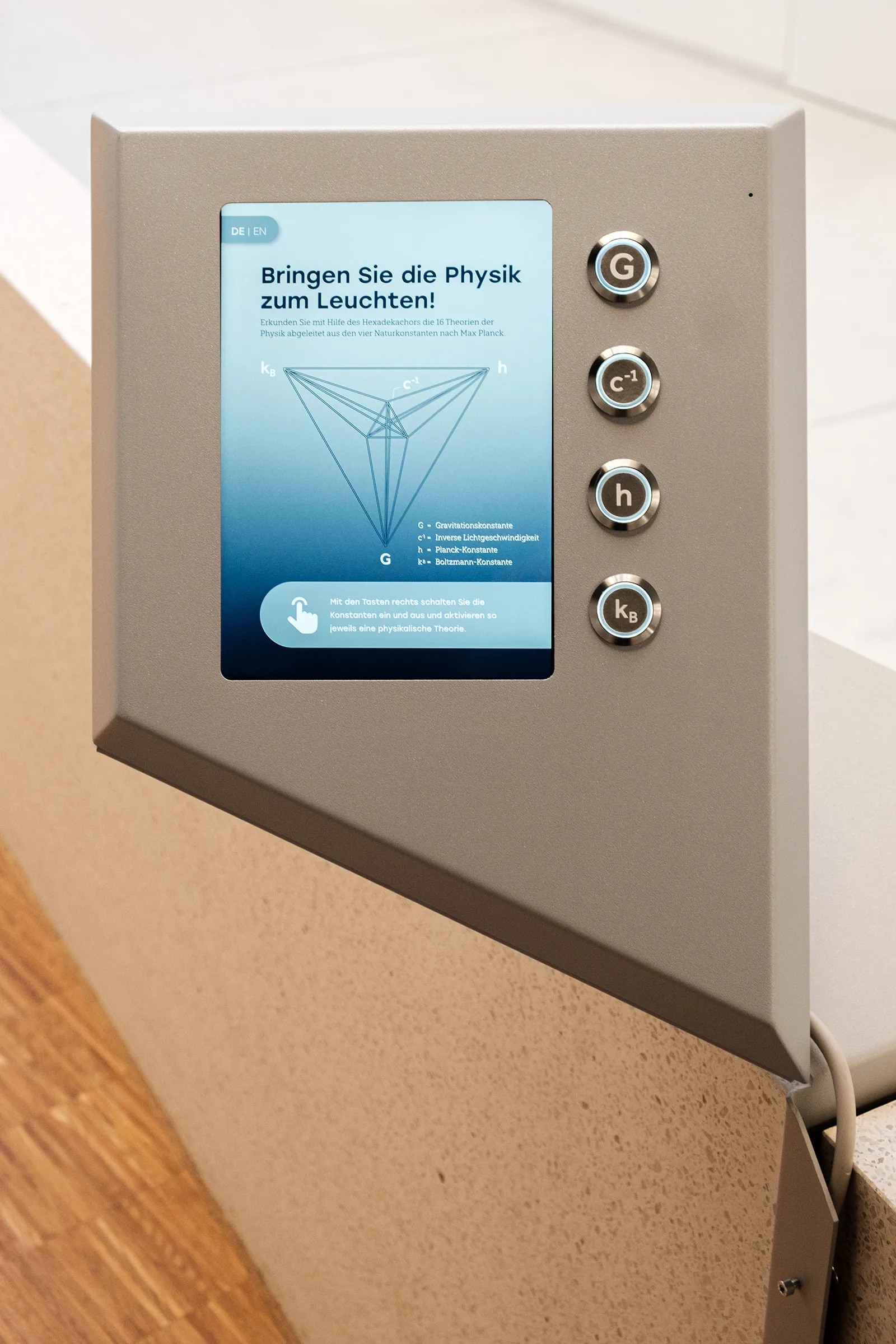 Interaction is achieved via four push buttons at the control station on the ground floor. Each button is assigned to a natural constant and equipped with an LED ring for status display. A microcontroller interprets the inputs and transmits them to an iPad serving as the user interface. The connection between the control station and the remote technical room is established via WLAN, eliminating the need for extensive cabling.