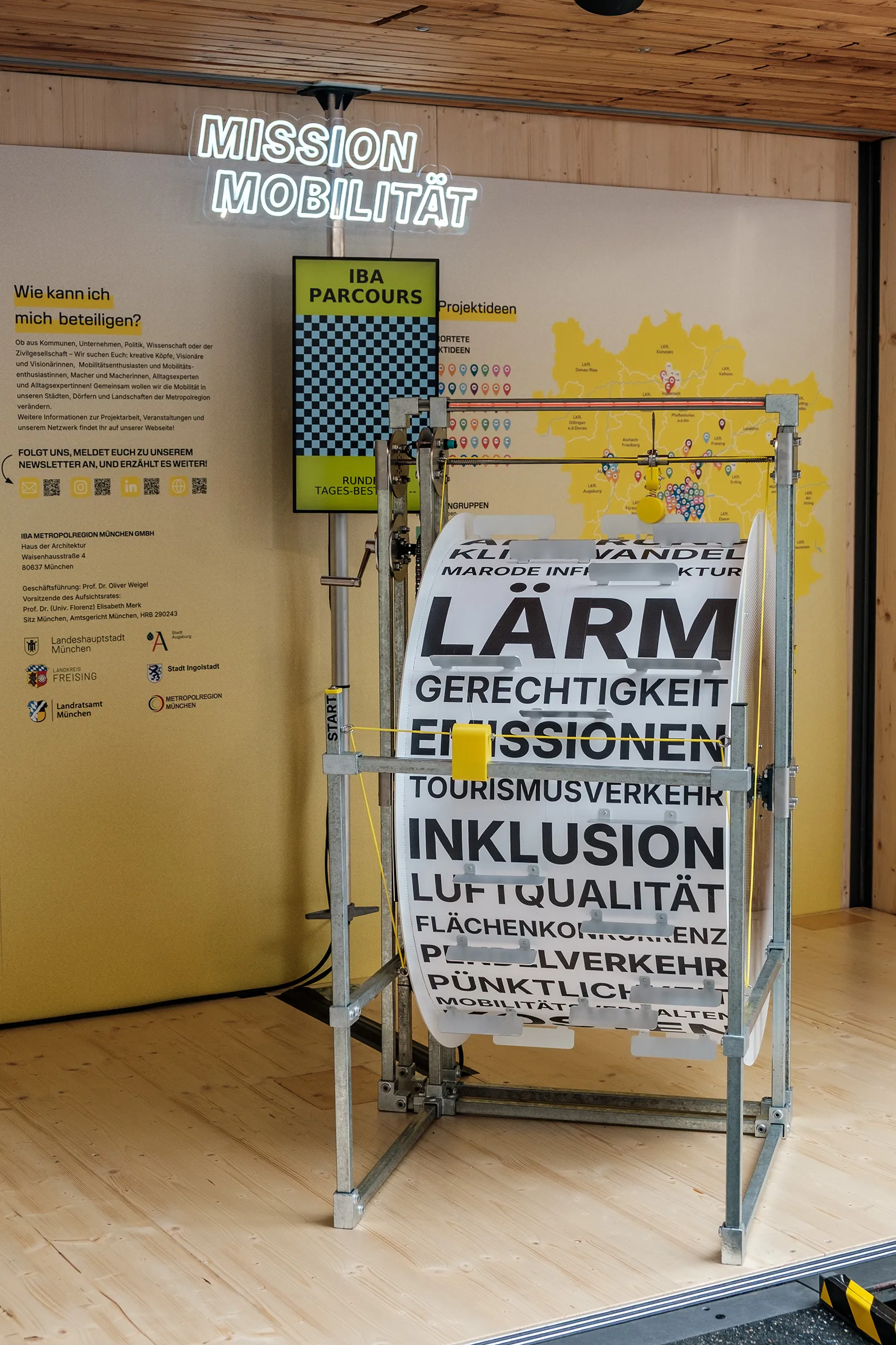 At the IBA Parcours, visitors navigate through an obstacle course symbolizing the mobility challenges of the next ten years in the Munich Metropolitan Region. Just like in a classic jump’n’run game, the goal is to find the right path while skillfully avoiding obstacles.